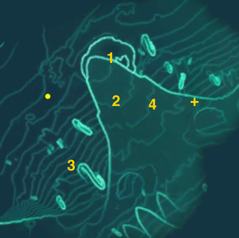 This mission can be especially confusing because the four objectives involve only one 敌人 each and have identical wording, differing only in the location of the 魅灵无人机. This can mislead the player into thinking there is only one objective and that the first three 魅灵无人机 are optional. However, careful exploration shows that each one appears only after the previous one is defeated. The first is in a pool of water, the second is near the pool, the third on the southwest slope, and the fourth is atop the overhang above the pool.