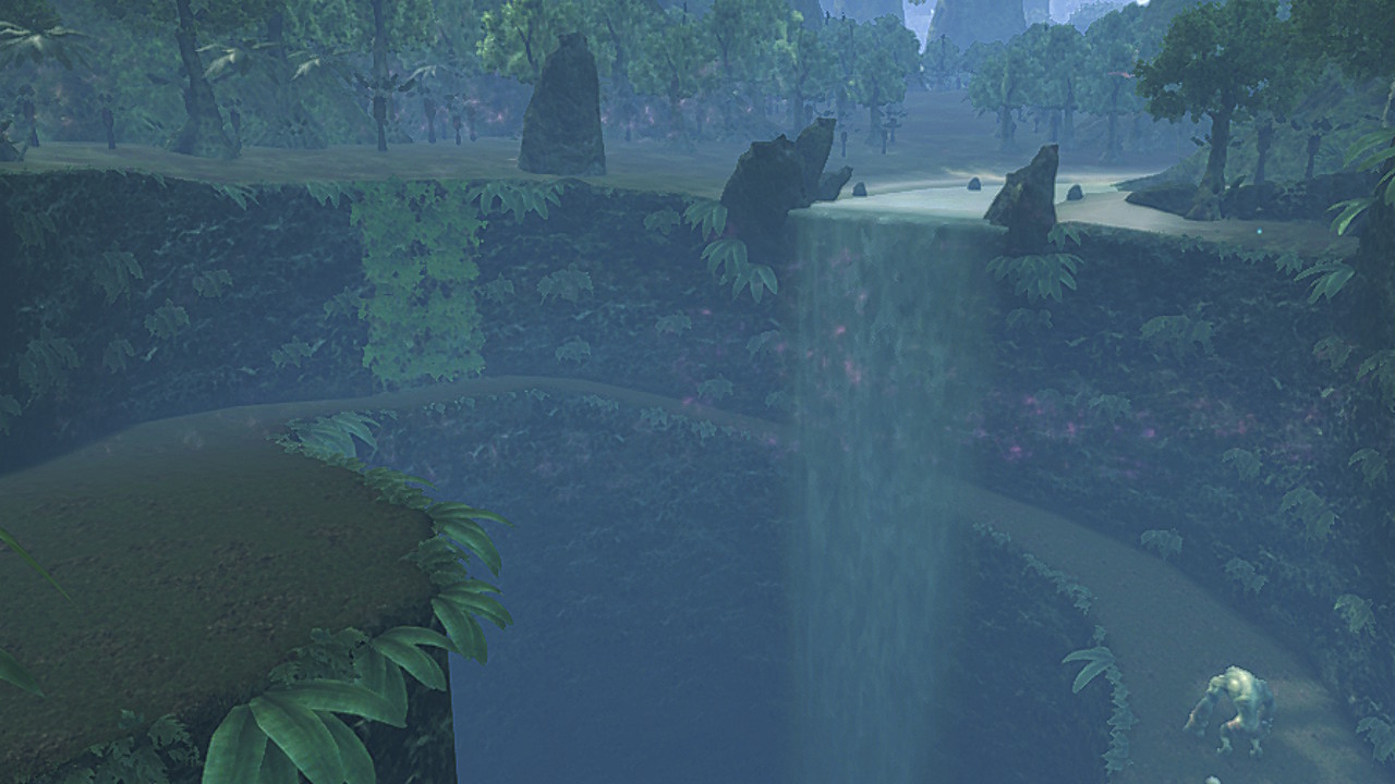 Abyss Basin is a location in 异度神剑. It is located in Makna Forest, in the southeast section of the map, just west of Precipice Bridge and south of Windmill Pavilion. It is a bottomless valley with a path spiraling down along its walls. It ends at a Fire 以太 Deposit, guarded by a Sabulum Orluga, two Arena orlugas, a Bois Hode and a Hyle Hode.