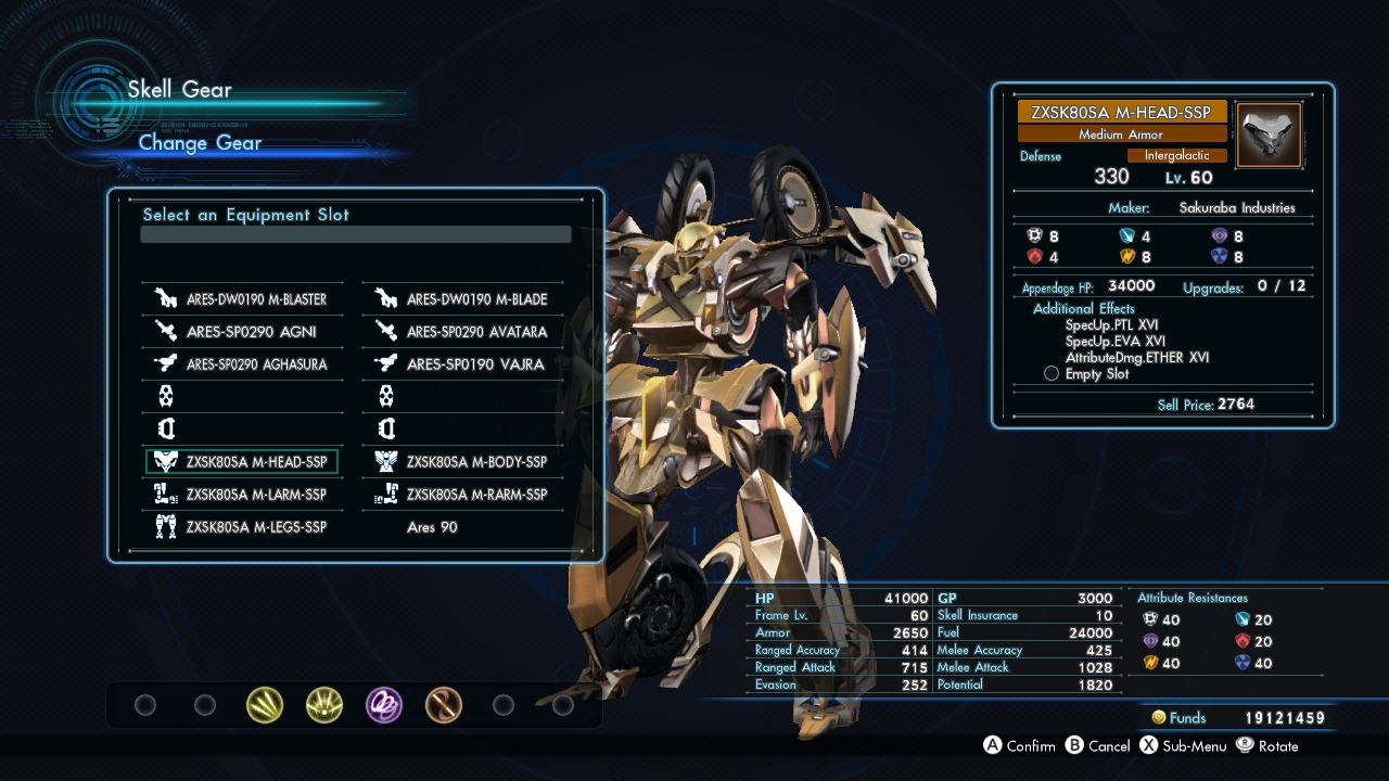 Just like the 阿瑞斯.70, the 武器 and 防具 on the 阿瑞斯.90 Doll cannot be altered, leaving it with set 武器. The 阿瑞斯.90 is equipped with M-BLADE and M-BLASTER sidearms, as well as Medium SSP 防具. It is also equipped with a set of two back and two 肩 武器 with corresponding battle arts. All 武器 have three open slots for 芯片.