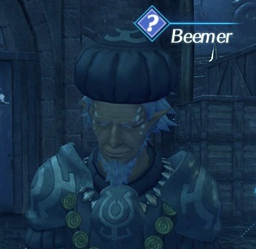 Beemer is an NPC in 异度神剑 2. He is an elderly Urayan who can be found at Fonsa Myma Port in the Kingdom of Uraya. He gives the DLC Quest A Hat Fit for a Lady available as downloadable content, the New Quests Pack 3 of the Expansion Pass.