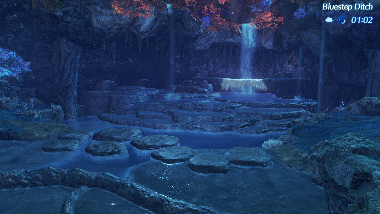 Bluestep Ditch is a location in 异度神剑 2. It is located in the Stomach area of the Kingdom of Uraya, between Cobalt Cliffs and Minnet Terrace. It is the entire area surrounding Eight-Rock Skip.