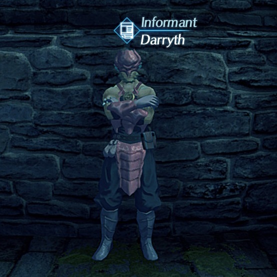 Darryth is an NPC in 异度神剑 2. He is an Urayan who can be found on the platforms above Torika Alley in the Kingdom of Uraya. He runs the 情报人员 (Fonsa Myma) shop.