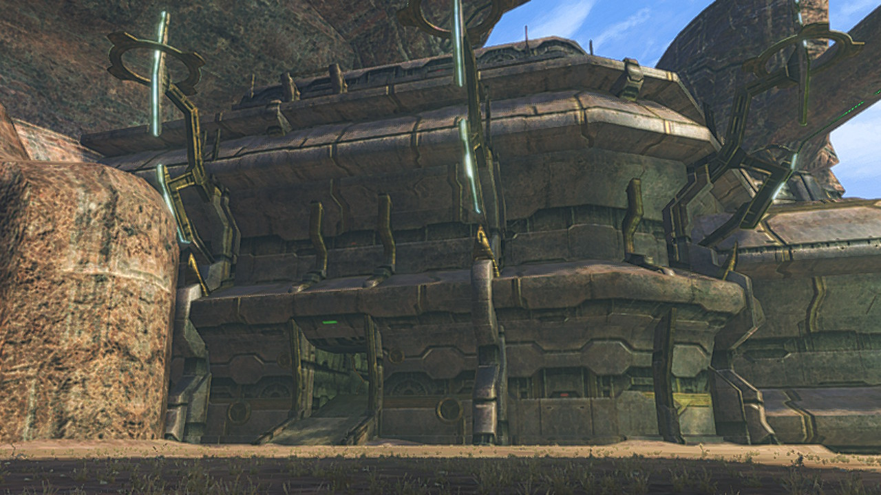 Enalda 魂控 Base is a landmark in 异度神剑. It is the third of the four Mechon facilities in Sword Valley, beyond Ged Fortress and Dolgan Outpost, just before Galahad Fortress. It is a two story building located on the side of the 以太 Storage Area location. On the first floor, it houses the 魂控 panel for the 3rd Gate and its Unique Monster, the Tranquil Morax. It has a balcony-like platform that wraps around the second floor, including a space similar to an alley behind the base, where four large Mechon attempt to pin the party in when they arrive. Besides Galahad Fortress, it is the largest and most hazardous of the Sword Valley facilities, and includes a wide variety of Mechon units.