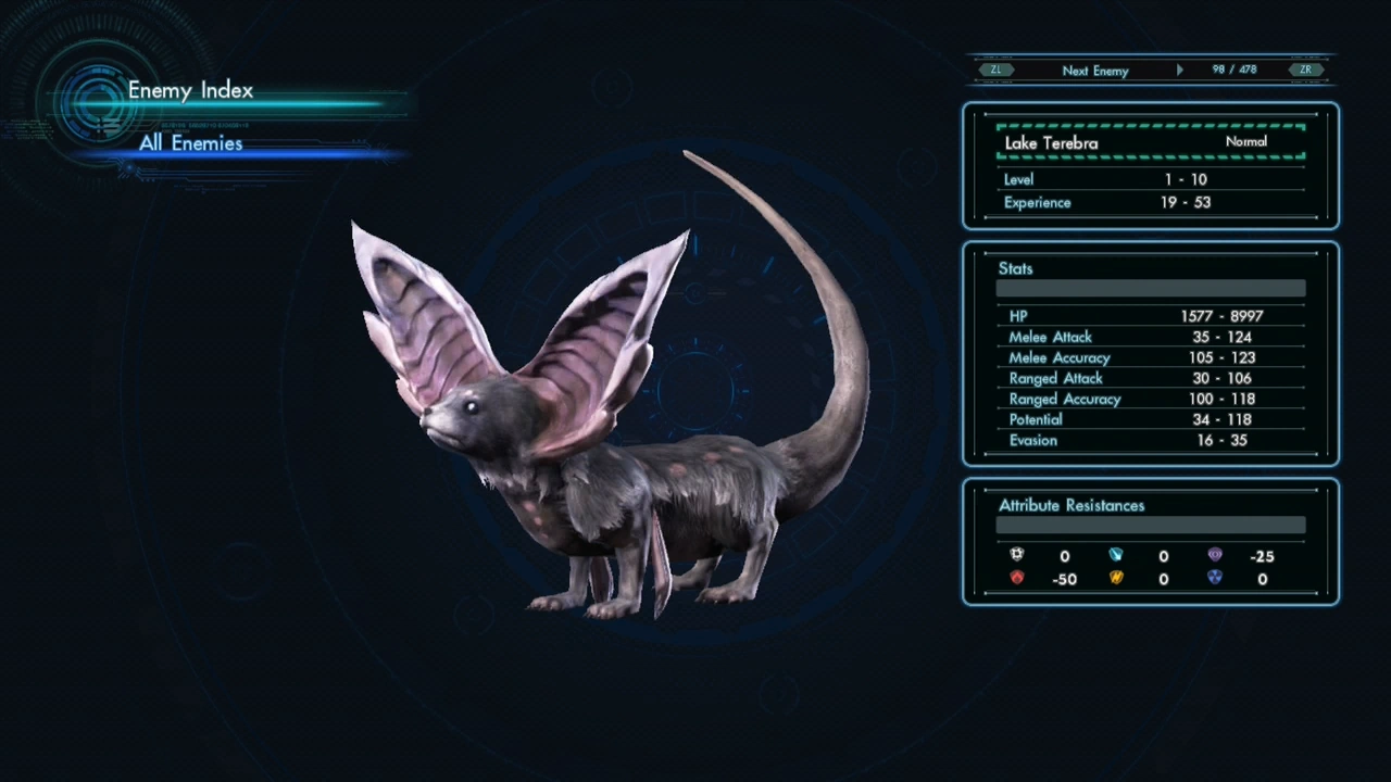 An entry is added to the 敌人 Index when the party enters combat with the opponent, even if the party flees the battle. Defeating a particular 敌人 1 – 3 times will update the entry with more details, including its HP and 其它 stats, resistances, base EXP awarded for defeating it, and special conditions for appearances like time or weather.