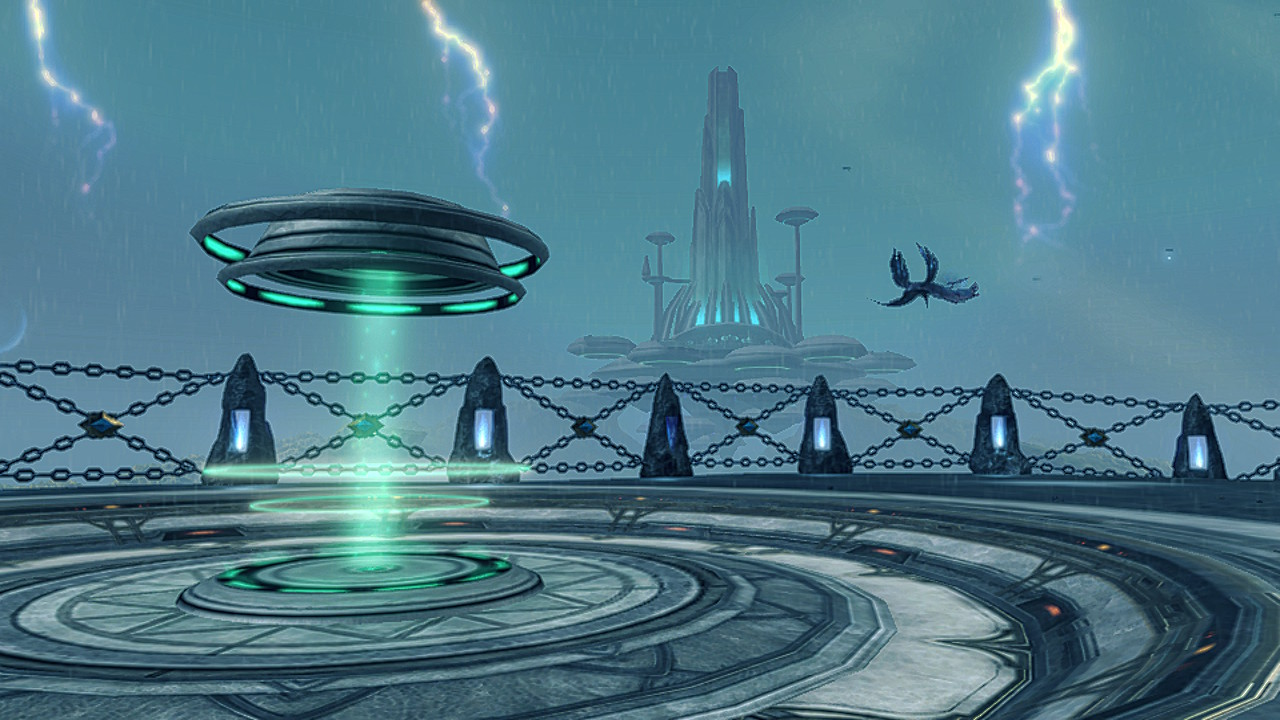 View of Prison Island from the High Entia Transporter during the permanent thunderstorm weather effect