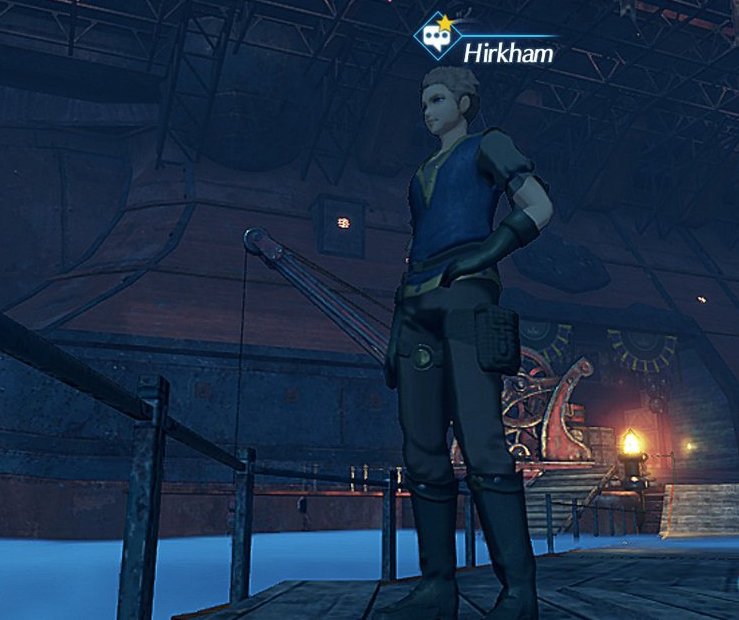 Hirkham is an ardainian in 异度神剑 2. He can be found at Goldmouth Return Port in the Argentum Trade Guild. Paying him the 15 Gold mooring fee in 第1章 counts towards Perun's Level 2 "Key 牵绊 Reward".