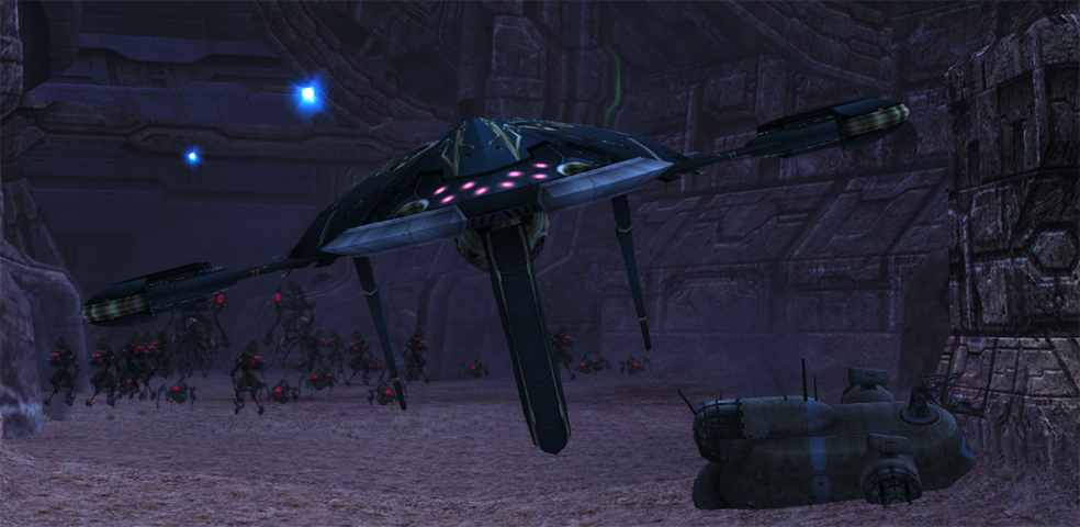 Mechon Carriers have a domed top, with a single engine at the back emitting eight pink light. The individual Mechon are housed on the underside of the vehicle and transported in a dormant state. When it comes time to deploy the Mechon, they are activated (identified by a red light coming on) and can be released from the vehicle as individual units. As Mechon are able to fall a long way with little to no damage, the Carrier does not need to be able to land or even fly low in order to deploy its full payload.