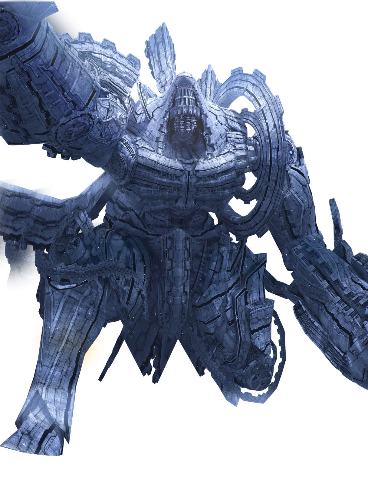 The 将军 appearance of Mechonis is a towering, mechanical black warrior. It has no "true" face, similar to the Mechon themselves. Instead, it has red eyes arranged in an almost church or fortress-like pattern. Its body is clunky and bulky, unlike Bionis' more sleek and graceful design. The giant sword that Mechonis wields is actually the location of the Battle of Sword Valley.