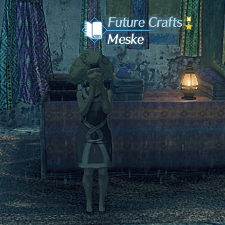 Meske is an NPC in 异度神剑 2. She is a leftherian who can be found in the Leftherian Archipelago's Fonsett Village. Meske runs a shop called Future Crafts specialized in Textiles.