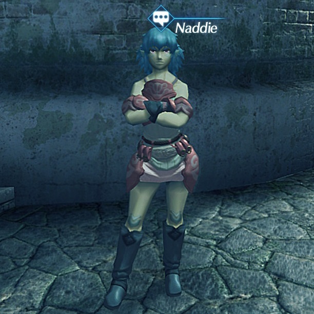 Naddie is an Urayan in 异度神剑 2. She stands by the stairs connecting the lower and upper levels of the 商业区 of Fonsa Myma in the Kingdom of Uraya. She is an old friend of 凡达姆's, having been his 伙伴 during one of their earliest 任务.