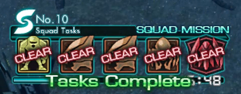 When the remaining number of 敌人 or collectibles for a 团队任务 reaches zero, that task is marked as having been cleared, and each member of the Squad receives 24 to 36 Reward Tickets. In addition, the 团队任务 indicator lights up to notify the player that a 团队任务 is now available at the Network 中央控制台.