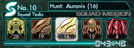 The specific objectives can be seen by holding the R button and repeatedly pressing the L button to cycle through the 团队任务. The details will appear above the icons: "Hunt" for 敌人 or "Collect" for collectibles, the name of the target, and the total quantity to be defeated or gathered. Collectibles from the player's inventory cannot be used to satisfy a 团队任务, they must be collected during the BLADE Mission to quality.