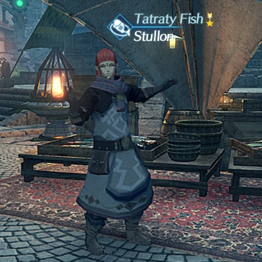 Stullon is an NPC in 异度神剑 2. Stullon is a Tantalese who can be found in the Kingdom of Tantal's Theosoir. Stullon runs a shop called Tatraty Fish specialized in Seafood.
