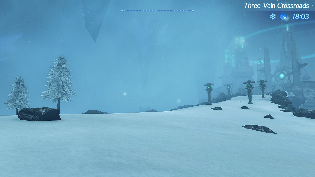 The Three-Vein Crossroads are a landmark in 异度神剑 2. They are located on the Upper Level of the Kingdom of Tantal. It is the junction of three different paths: to the south the Little Banerro Ruins, to the north the Sacred Ice Caverns, and to the east Theosoir via the Capital approach.
