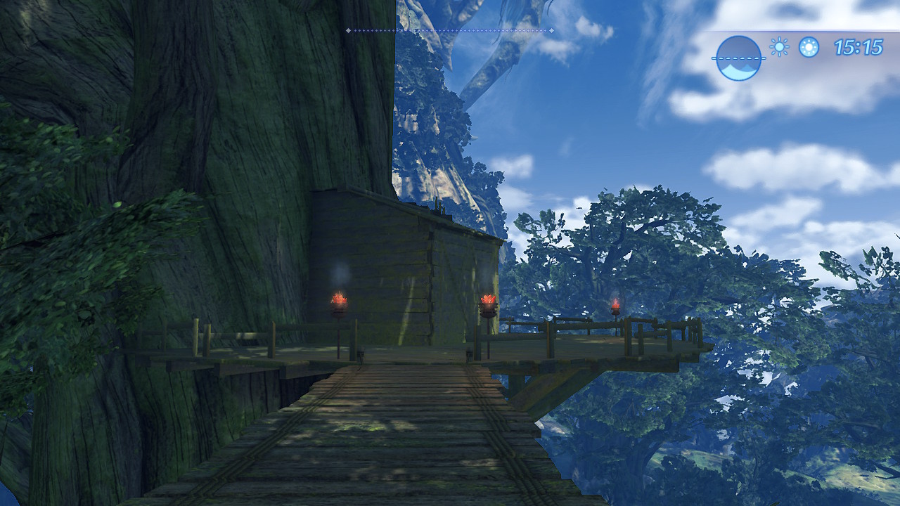 Tirkin Turf is a location in 异度神剑 2. It is a series of huts and platforms located in a tree above Twin Trunks Hill in the Upper Level - Right area of Gormott Province and is only accessible via a rope bridge that connects to Dawnview Grotto and Twin Trunks Hill.