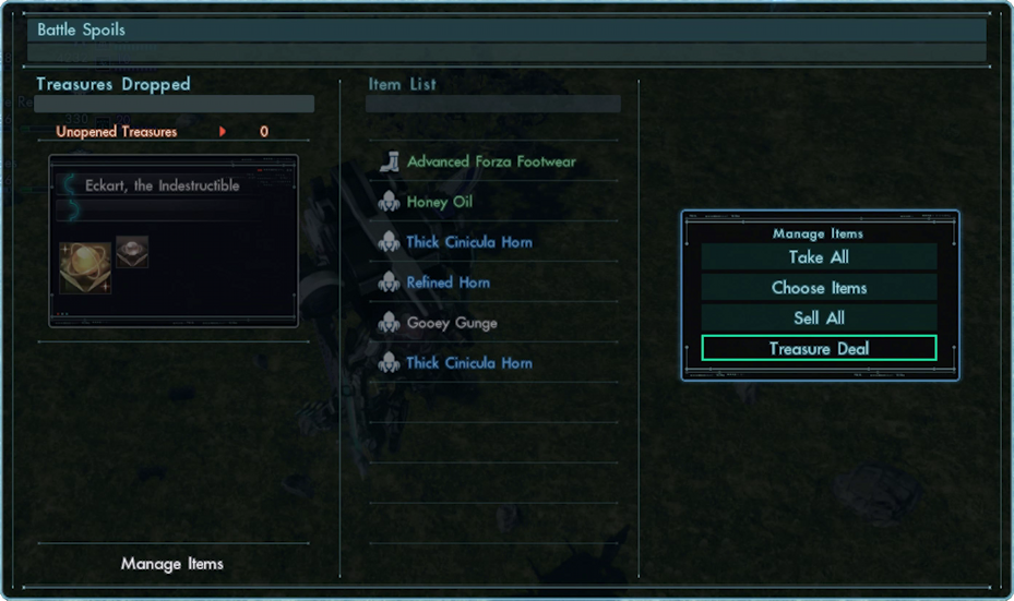 秘宝 Deal is a game Mechanic in 异度神剑X which allows 防具, 武器, or 芯片 received as battle rewards to be offered to 其它 members of the Squad. When the 秘宝 Boxes dropped by an 敌人 after a battle are opened, the player may offer one of the contents as a 秘宝 Deal. If there are 复数部位 valid 秘宝 Deal options, a player can choose to offer one 秘宝 Deal and then wait a few minutes to then enter and exit the Choose Items menu. After exiting the Choose Items, menu, if enough time has elapsed, a player may 秘宝 deal another valid item.