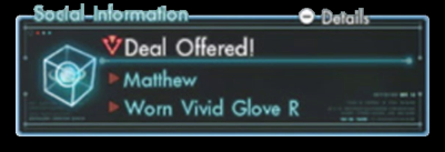 其它 players in the Squad, if they have the "Social Notifications" option enabled, will see a message with the name of the player offering the deal and the item being offered, and can press the Select (-) button if they are interested in that item. After a certain amount of time, one of the interested players is randomly chosen to receive the item; if only one player expressed interest, that player will receive it. Players offering 秘宝 Deals receive 50 or 100 BLADE Points depending on their 部门 for each 秘宝 Deal offered regardless of any 其它 player receiving it.