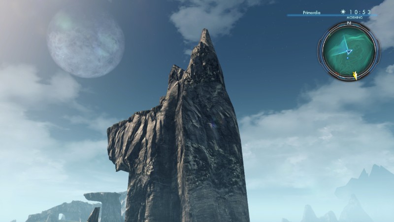 独角岩 is an area in 异度神剑X. It is a tall rock located in 原初荒野, north from 第一双子桥 and south from 第105区FN点. There are two distinct terraces; the lower is accessable by foot, but the upper can only be reached by flight. There is a small cave here, and a level 3 archaeological 秘宝 Box.